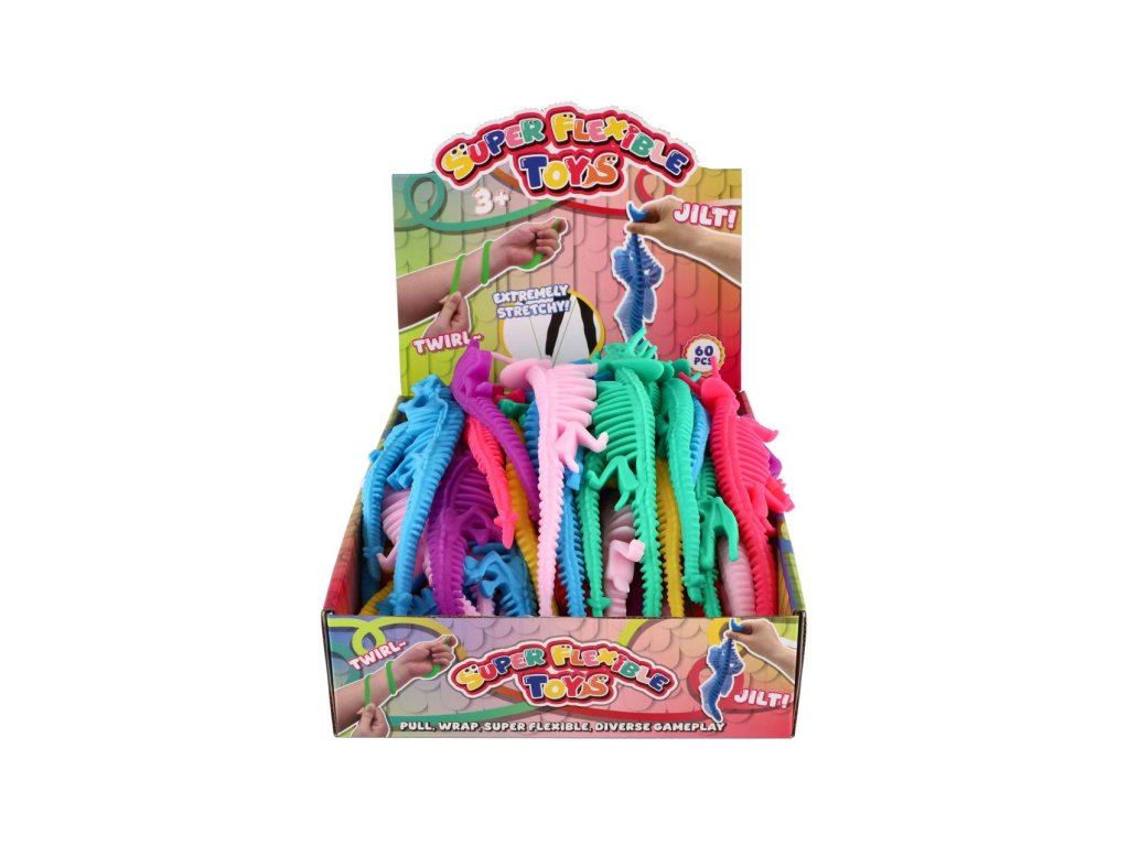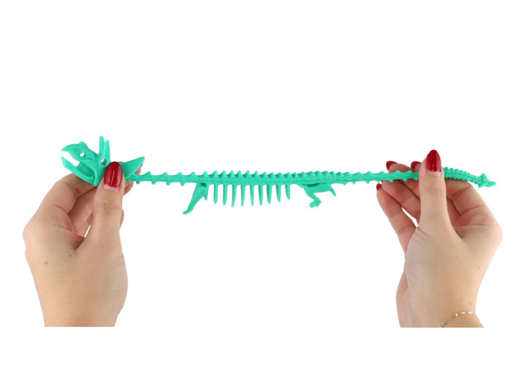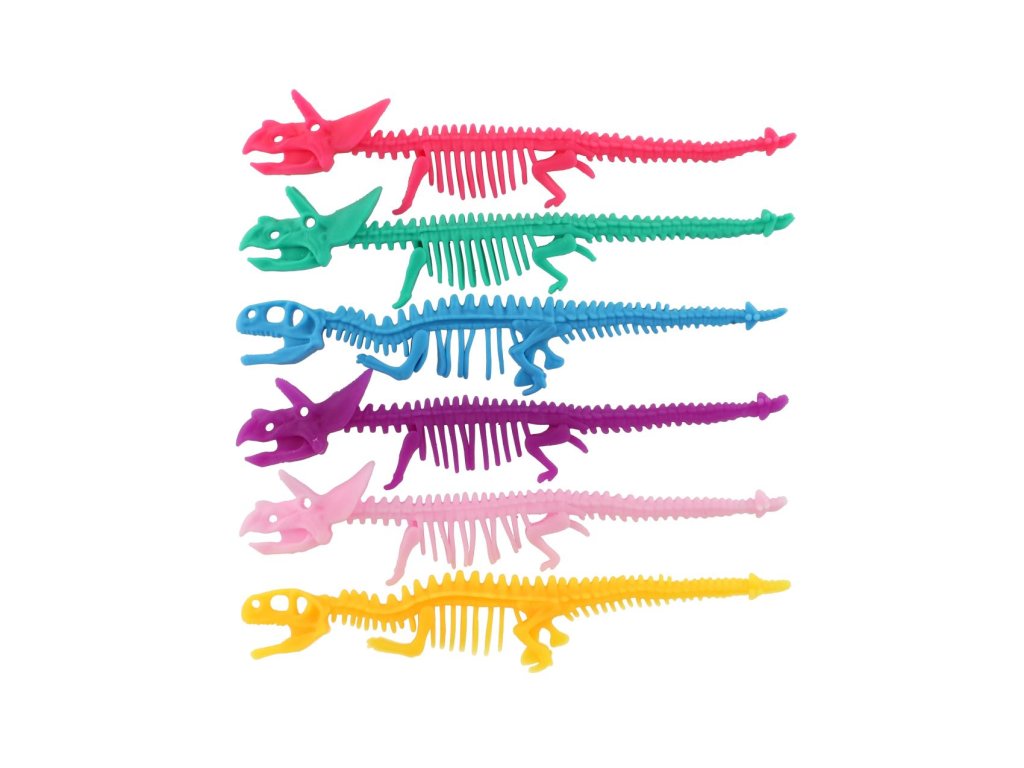 Barevná antistresová hračka ve tvaru kostry dinosaura, která je vyrobená z příjemně měkkého a pružného silikonu. Ideální na mačkání, natahování nebo zklidnění během stresových situací.